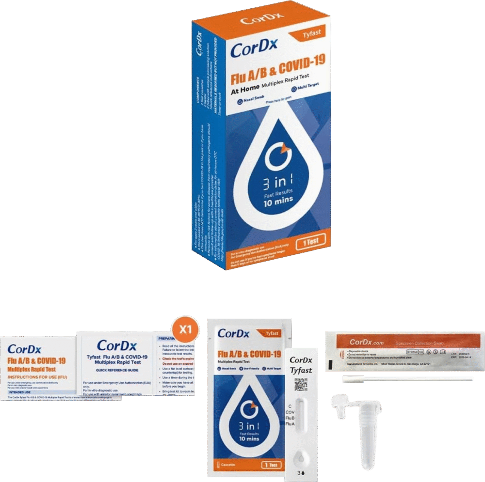 The CorDx Tyfast Flu A/B and COVID-19 Multiplex Rapid Test is a lateral flow immunoassay intended for the qualitative detection and differentiation of SARS-CoV-2 and influenza A and B antigens. The test provides an efficient and accurate diagnostic solution in 10 minutes, giving healthcare providers and communities a fast and reliable way to prioritize their health.